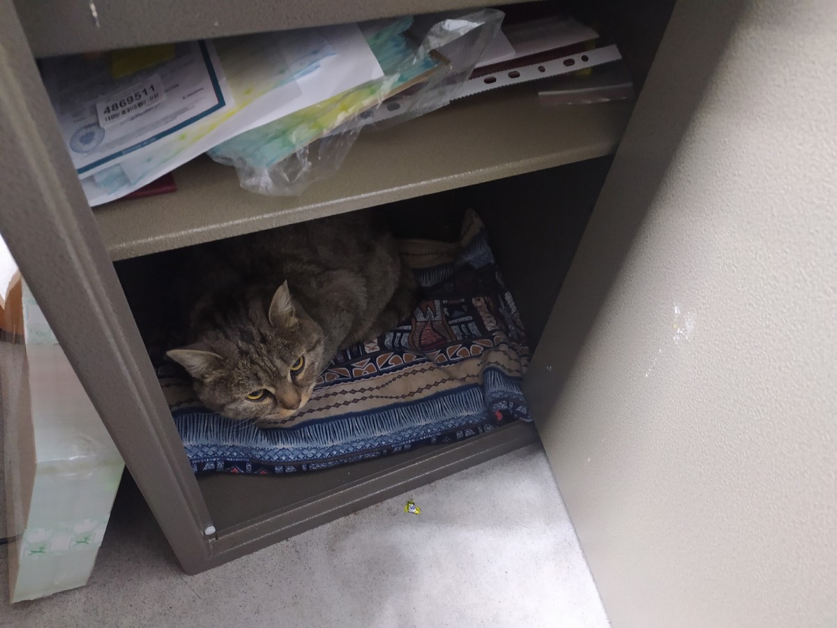 Волонтеру пришлось хватать её в шопер и везти на работу, где она проспала весь день в сейфе. Назвали кошку Гюзель (с турецкого - прекрасная).