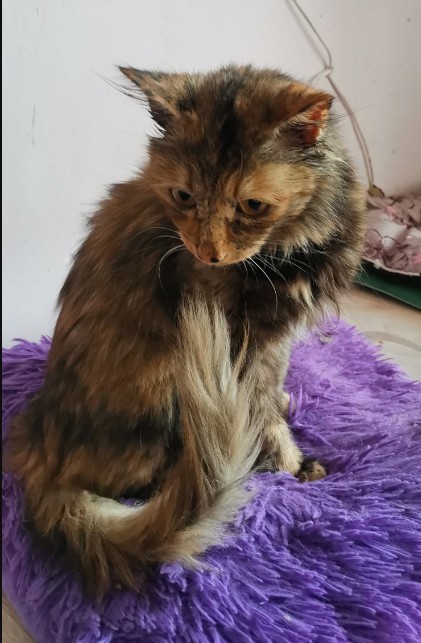 История трёхцветки Молли до боли банальна. Её беременную подкинули в подъезд жилого дома, соседи несколько раз порывались выкинуть, но благодаря тому, что кошечка спокойная и никогда в подъезде не пакостила, удалось договориться о её временном проживании пока не родятся котята.